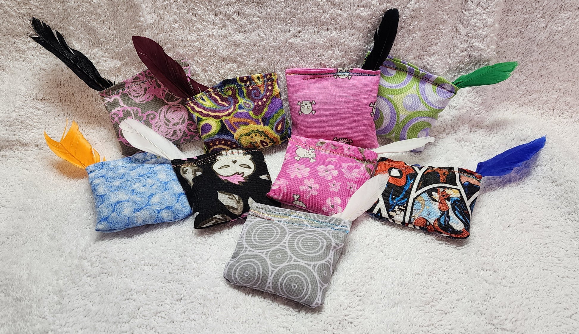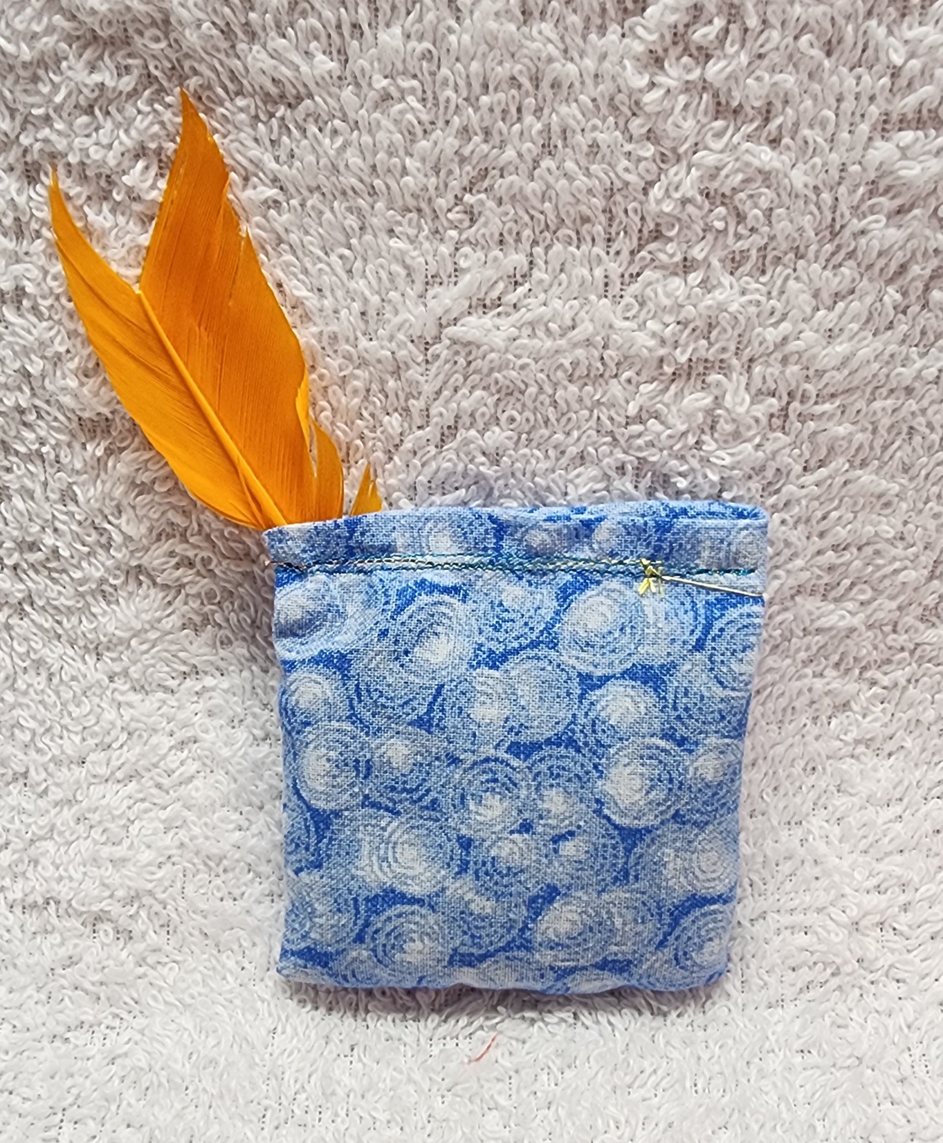 An adorable small satchel filled with a catnip & silvervine blend. The feather is an added touch to entice the predatory nature of your feline. Size: Roughly 2 in x 2in.